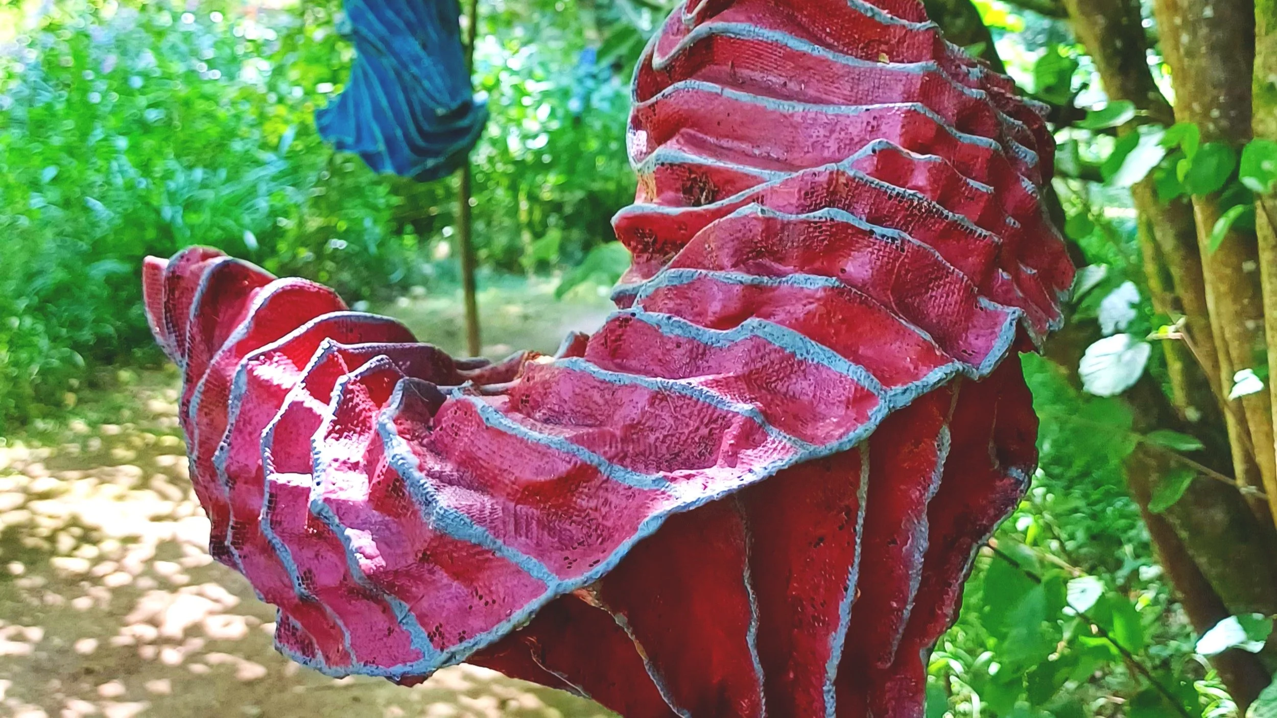 She manipulates lengths of aluminium mesh using techniques from a variety of sources such as origami, needlework, costume jewellery and macrame. She will coax and sew the aluminium into the desired form then strengthen it with steel and resin to become robust and weatherproof sculpture. Her work reflects a true love of garden plants, while the more abstract pieces are developed from my memories of scuba-diving over coral reefs. In addition, Andrews heavily expands tiny details of plant and sea life to “dominate the viewer on a human scale”, where she will painstakingly take techniques and ideas from Origami and embroidery to recreate fluid organic forms.
