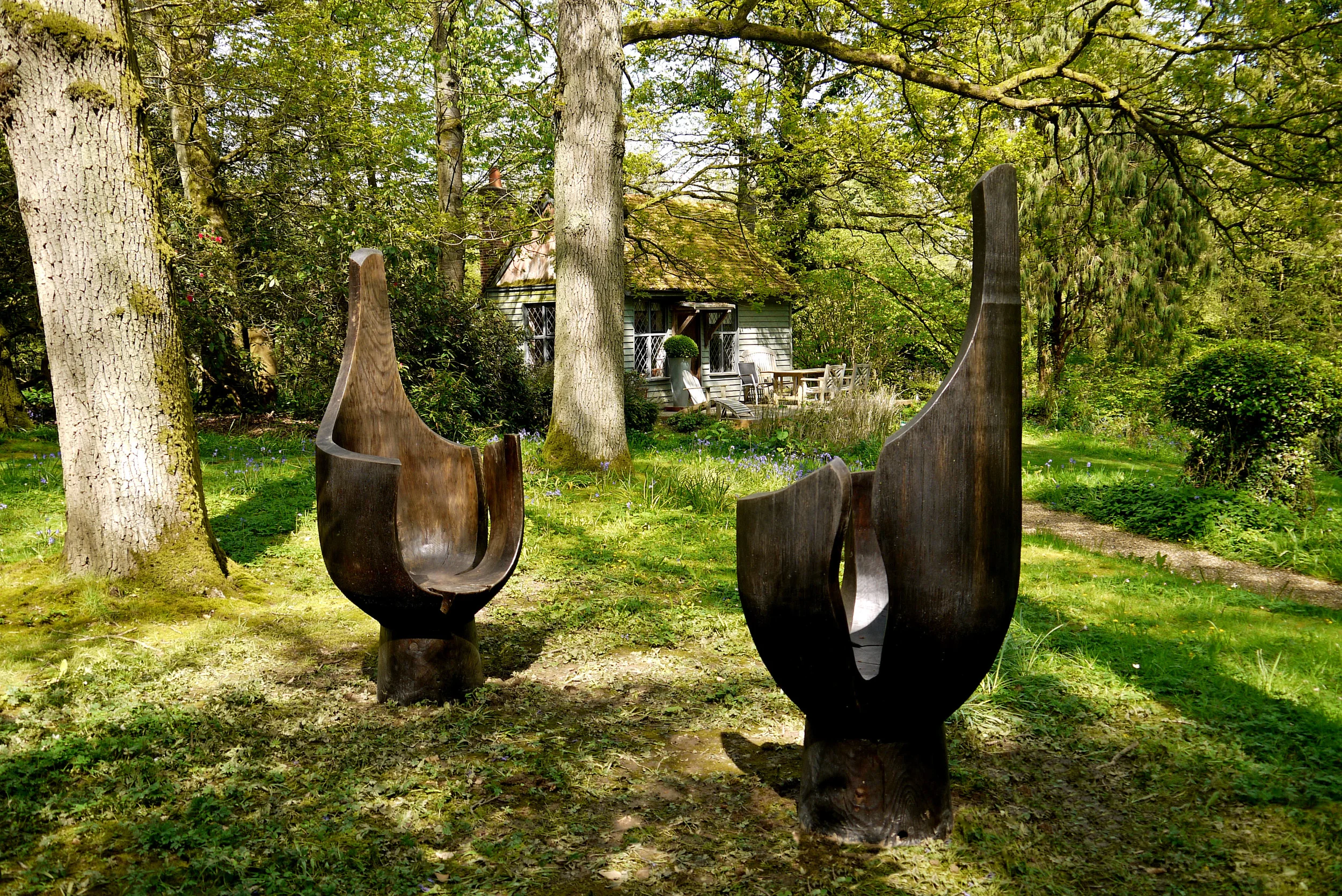 Liam O'Neil's magnificent 'Chair Form's are spectacular and imposing in their own right, but the fact that each one is turned and carved on a gigantic lathe outside O'Neill's workshop makes them all the more impressive. Whether the work is set against the rugged backdrop of the Irish west coast at O'Neill's studio, or placed amongst the luscious greenery of The Hannah Peschar Sculpture Garden, one can see the tenderness and supreme knowledge that goes into each one of O'Neill's pieces. From the large 'Bench'; carved to reflect a mountainous backdrop, or the tender 'Mini Cauldron'; with clever peepholes formed from the removal of knots, O'Neill's skill as a wood turner is undeniable. The cocoon-like outline of the 'Chair Form's allows one to tuck oneself away, almost invisible from any passers-by, and to immerse oneself in the surrounding woodland.