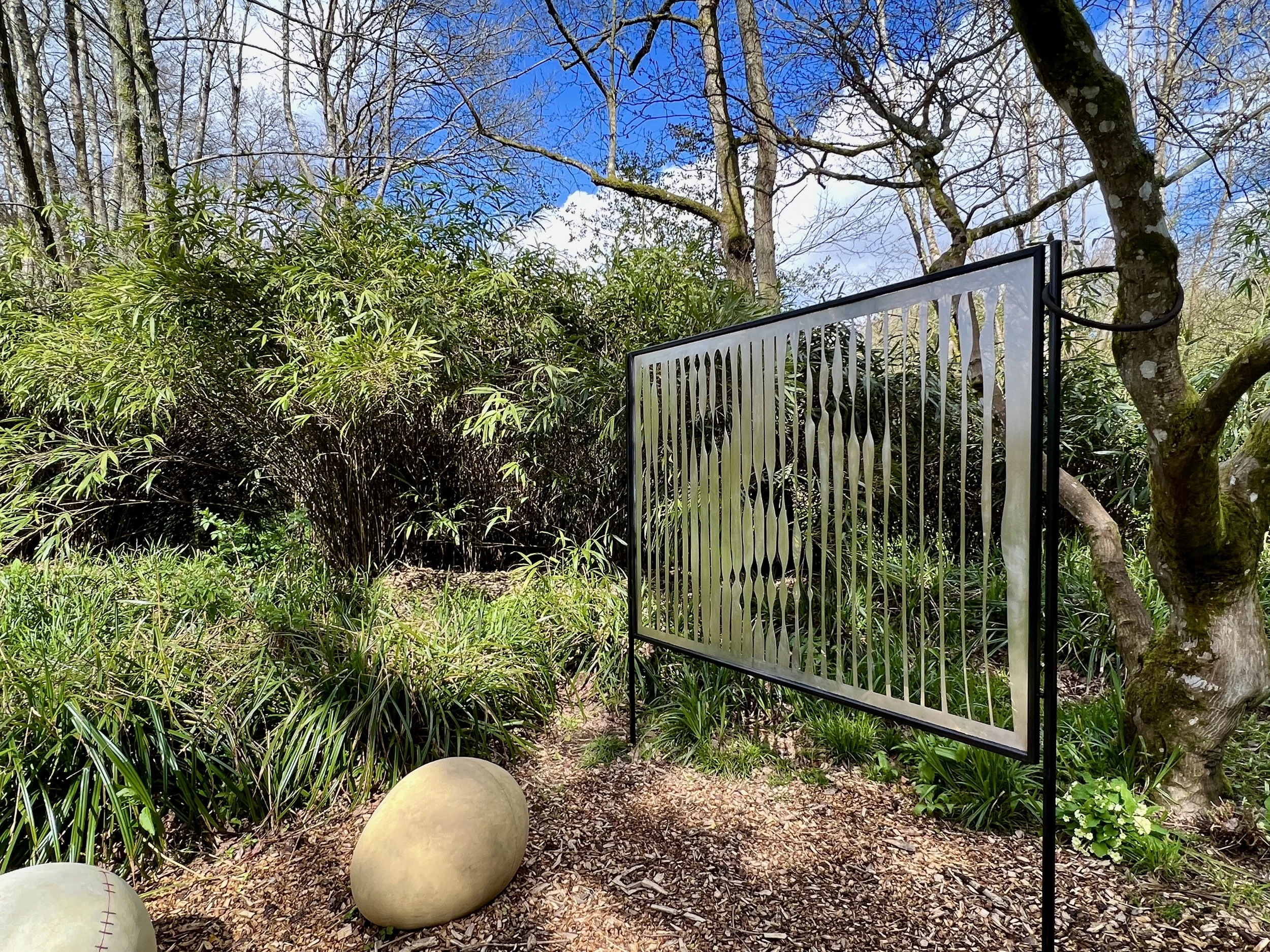 At The Hannah Peschar Sculpture Garden we of course celebrate Joseph’s sculptural work, and his latest installation engages at close range as an abstract reflecting the local surroundings and from a distance, life itself in the form of a human face.