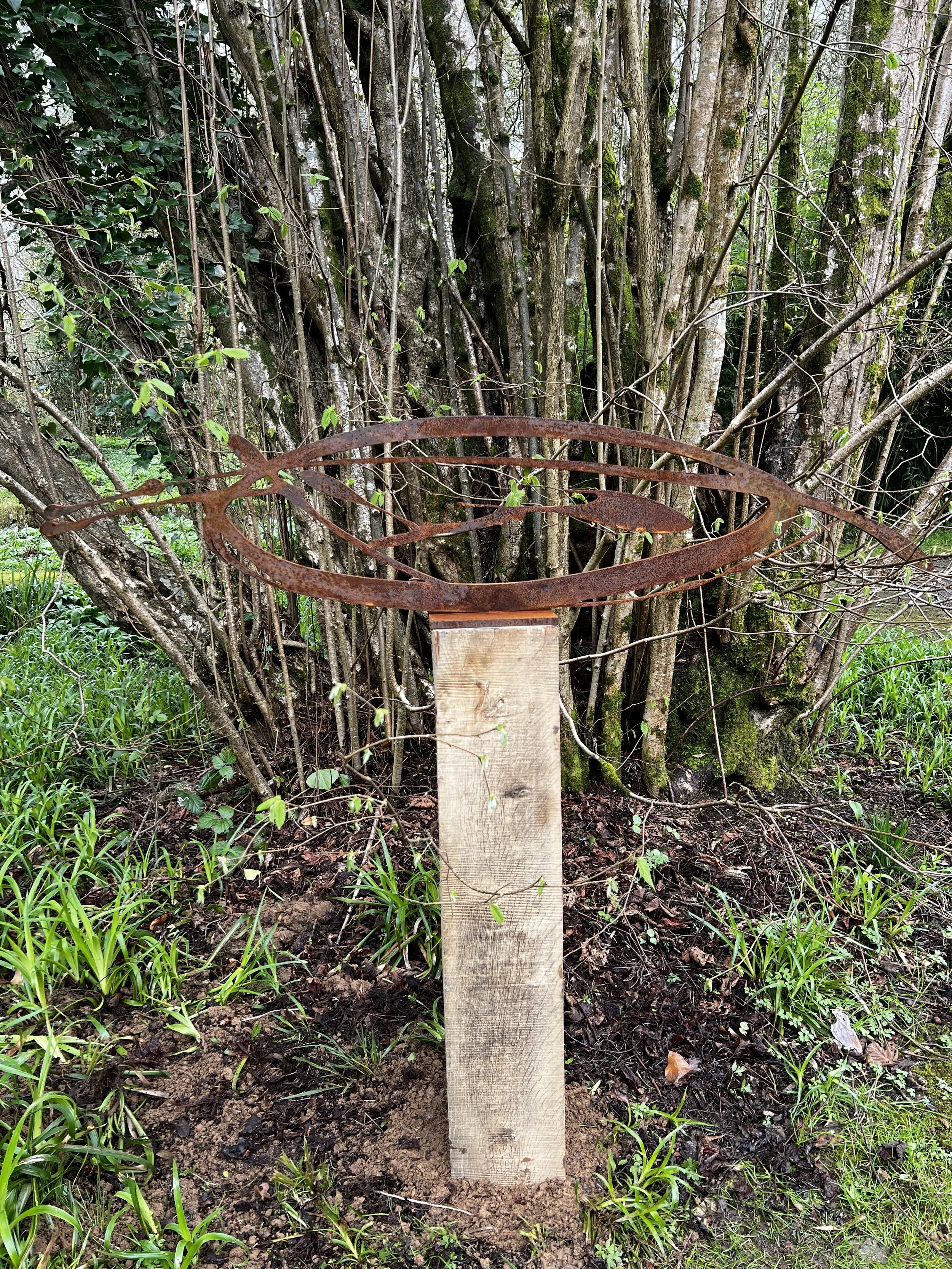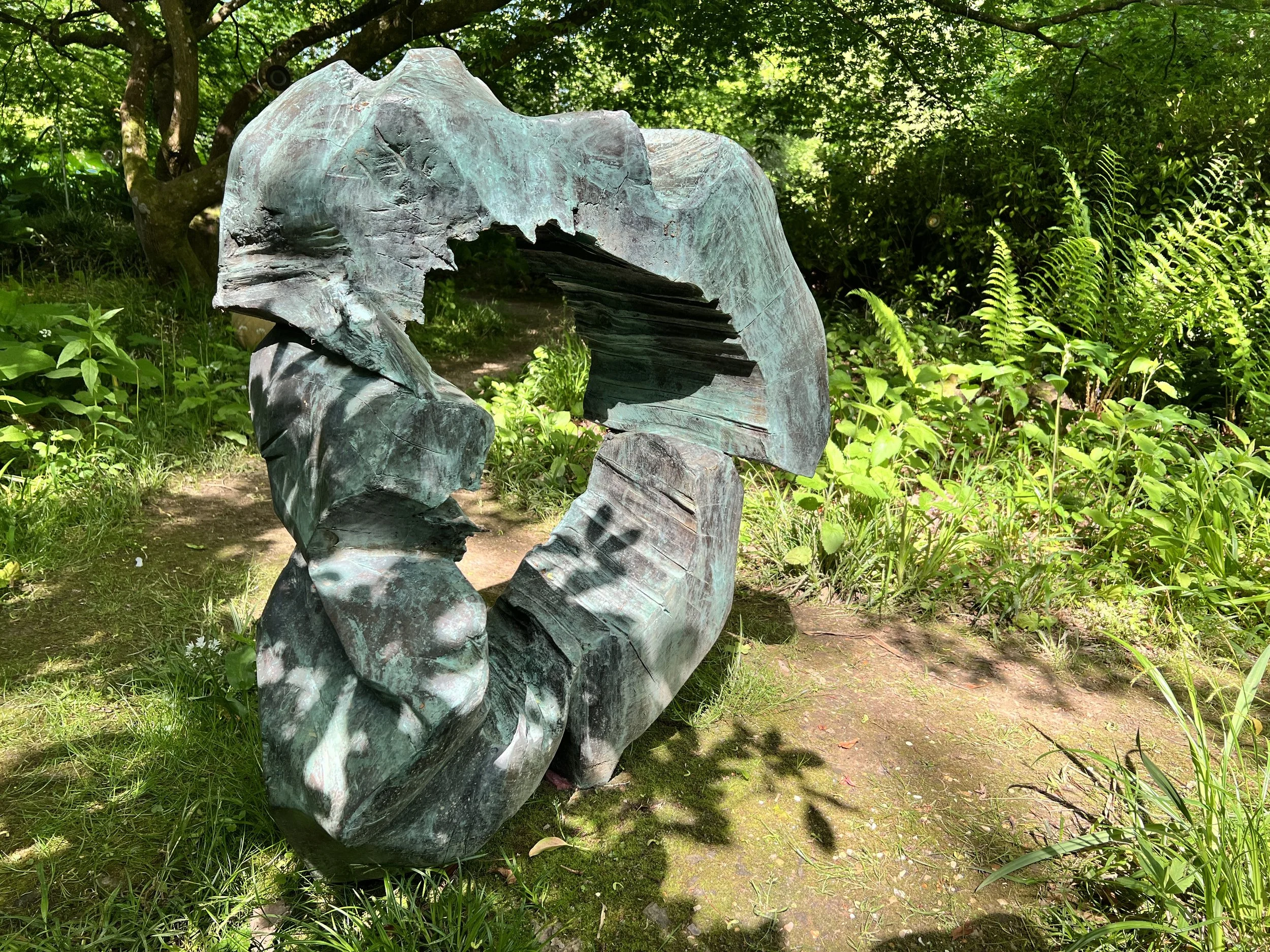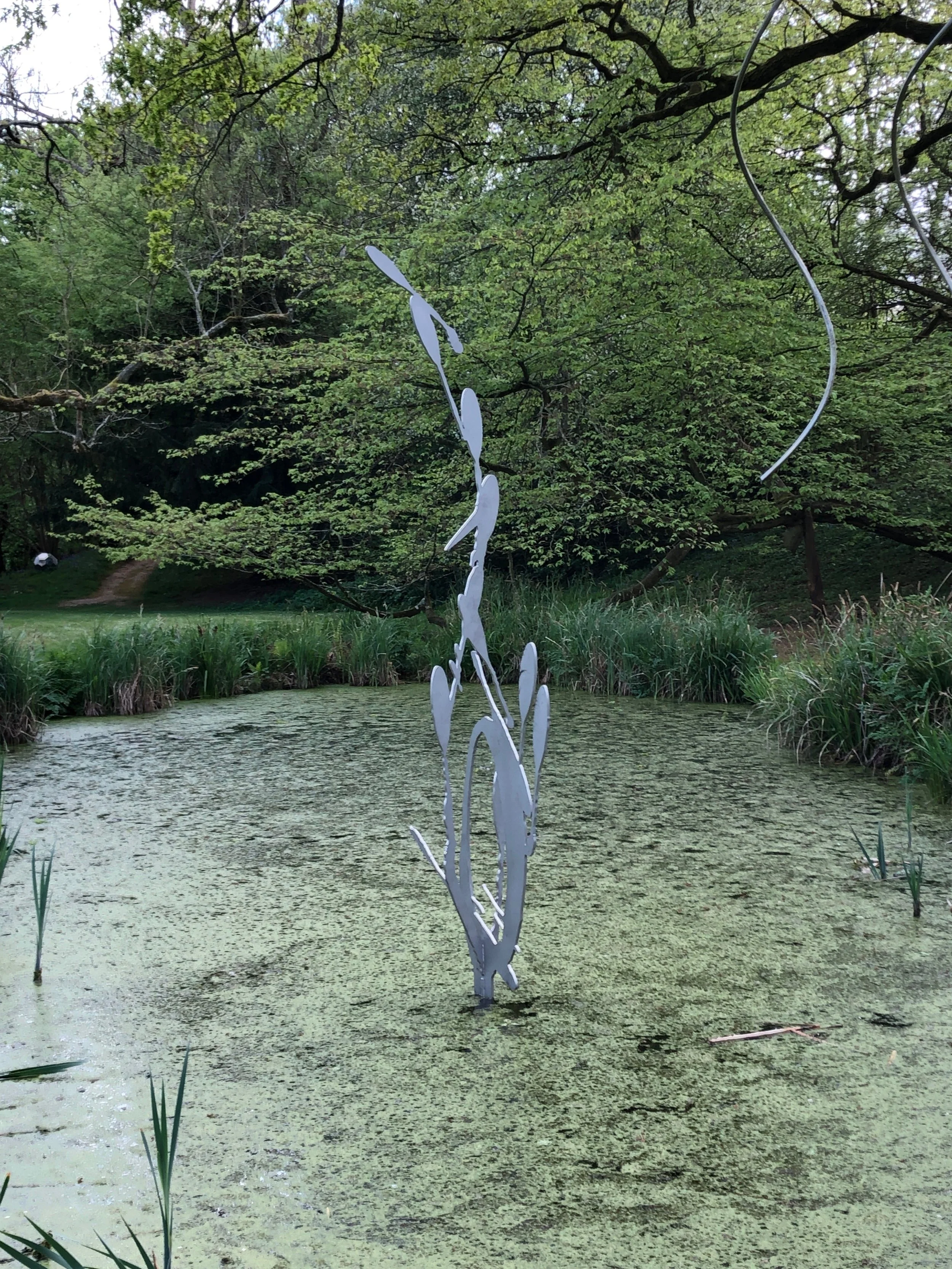 Dancing through the foliage surrounding the New Ponds is an intriguing series seeking to capture movement; a gesture; a concept. Using traditional brush and ink, Prins creates new ‘characters’, that rather than depicting a word, explore an idea. Titles such as ‘Growth’, ‘Balanced Movement’ and ‘Soft Wind’ indicate her thoughts behind the works, but part of the joy is drawing one’s own conclusions from the work. She then traces the brushwork onto stainless or corten steel, and immaculately cuts them out so that each tiny detail of the original remains.